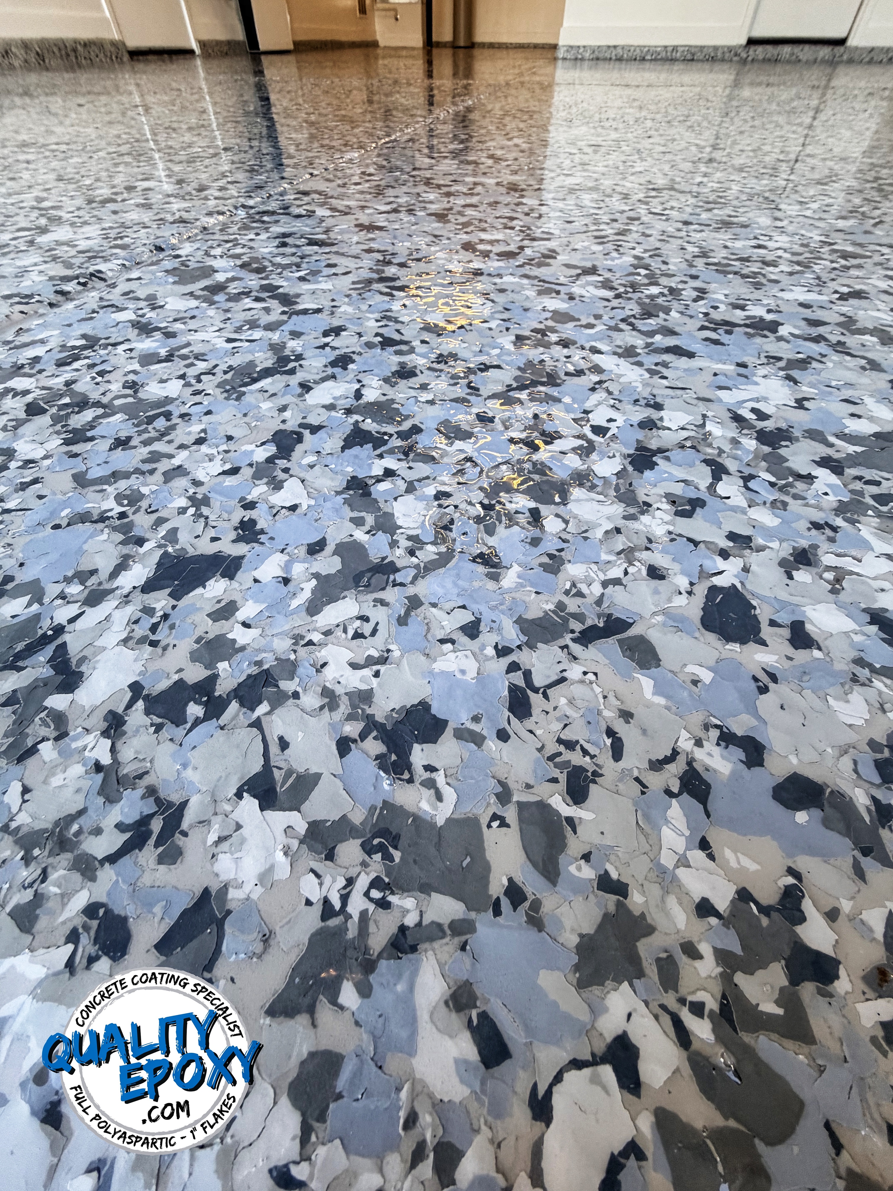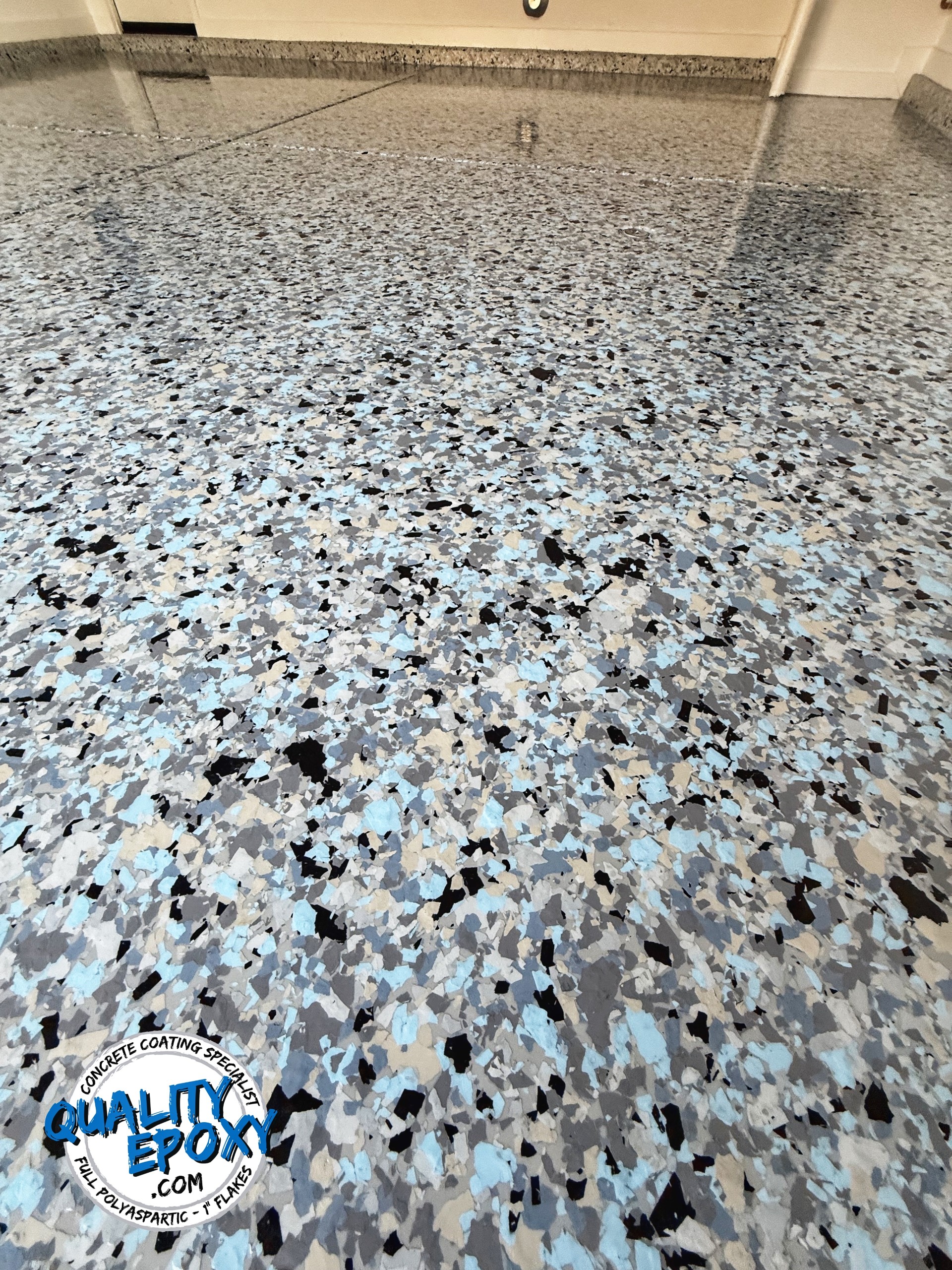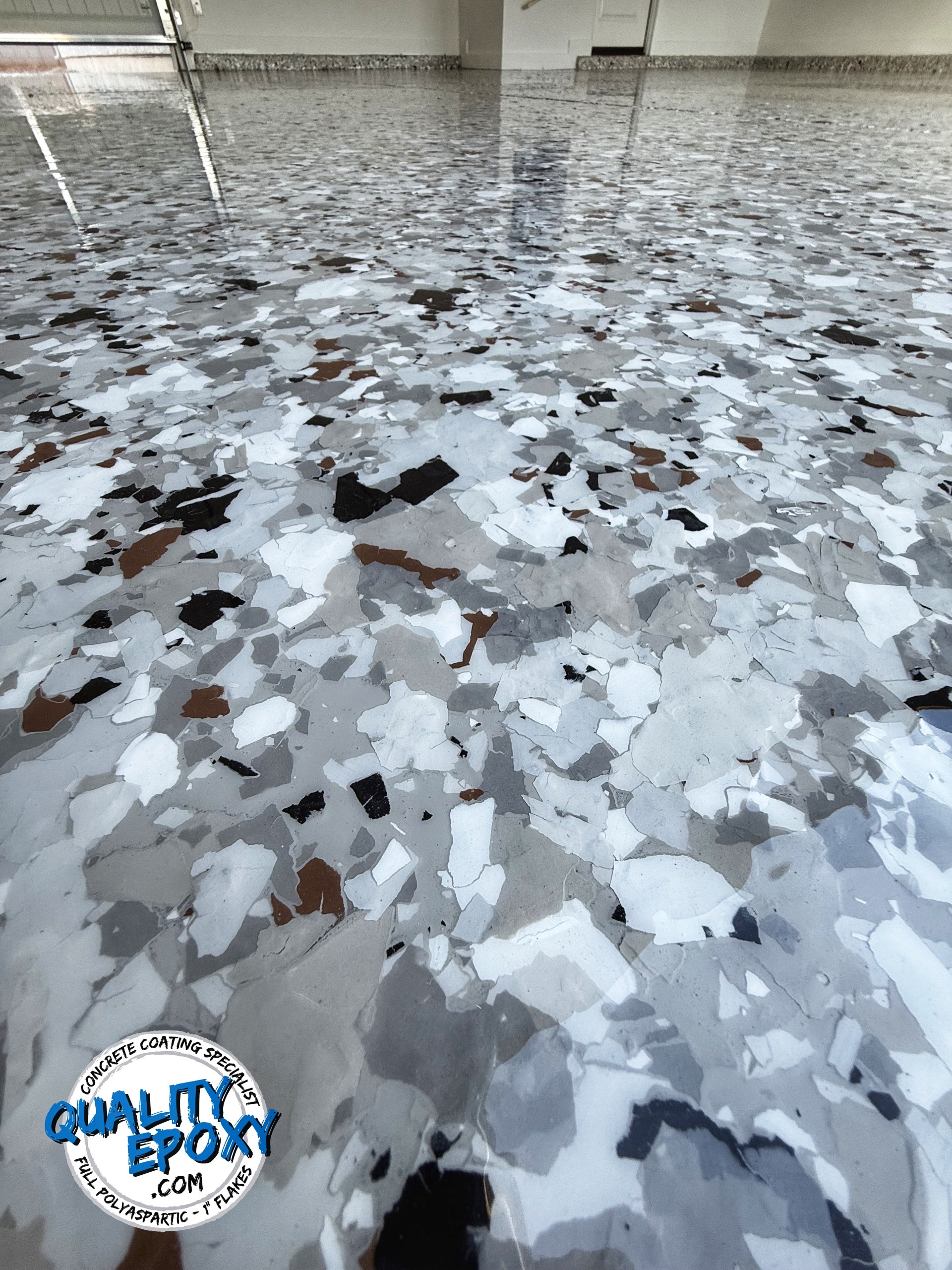 Our 1" Flakes Floors are the best you'll find globally in the industry, crafted exclusively with high-solids polyaspartic from start to finish. That means your floors will never